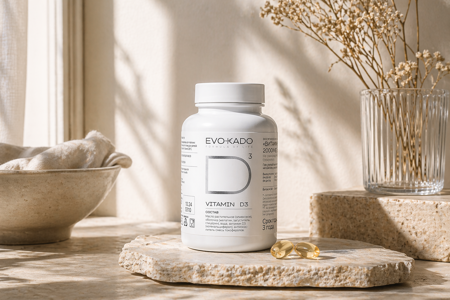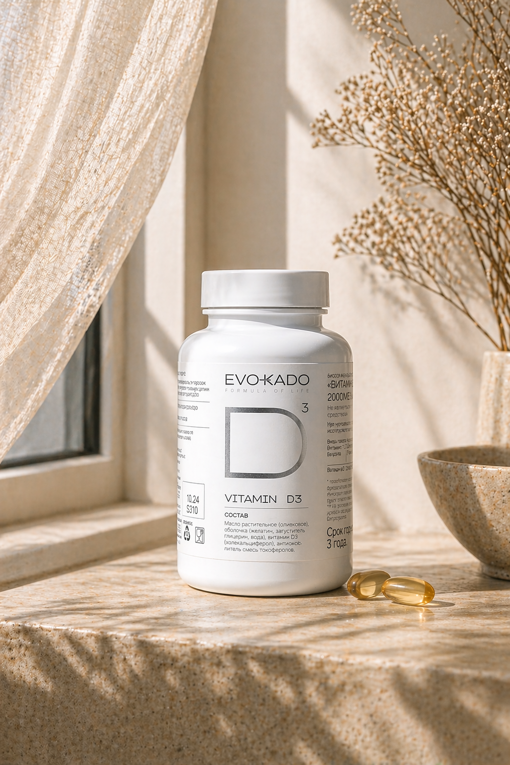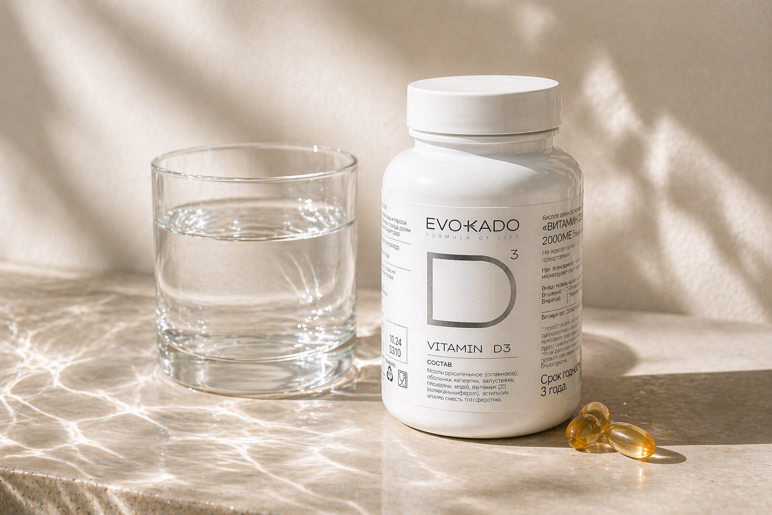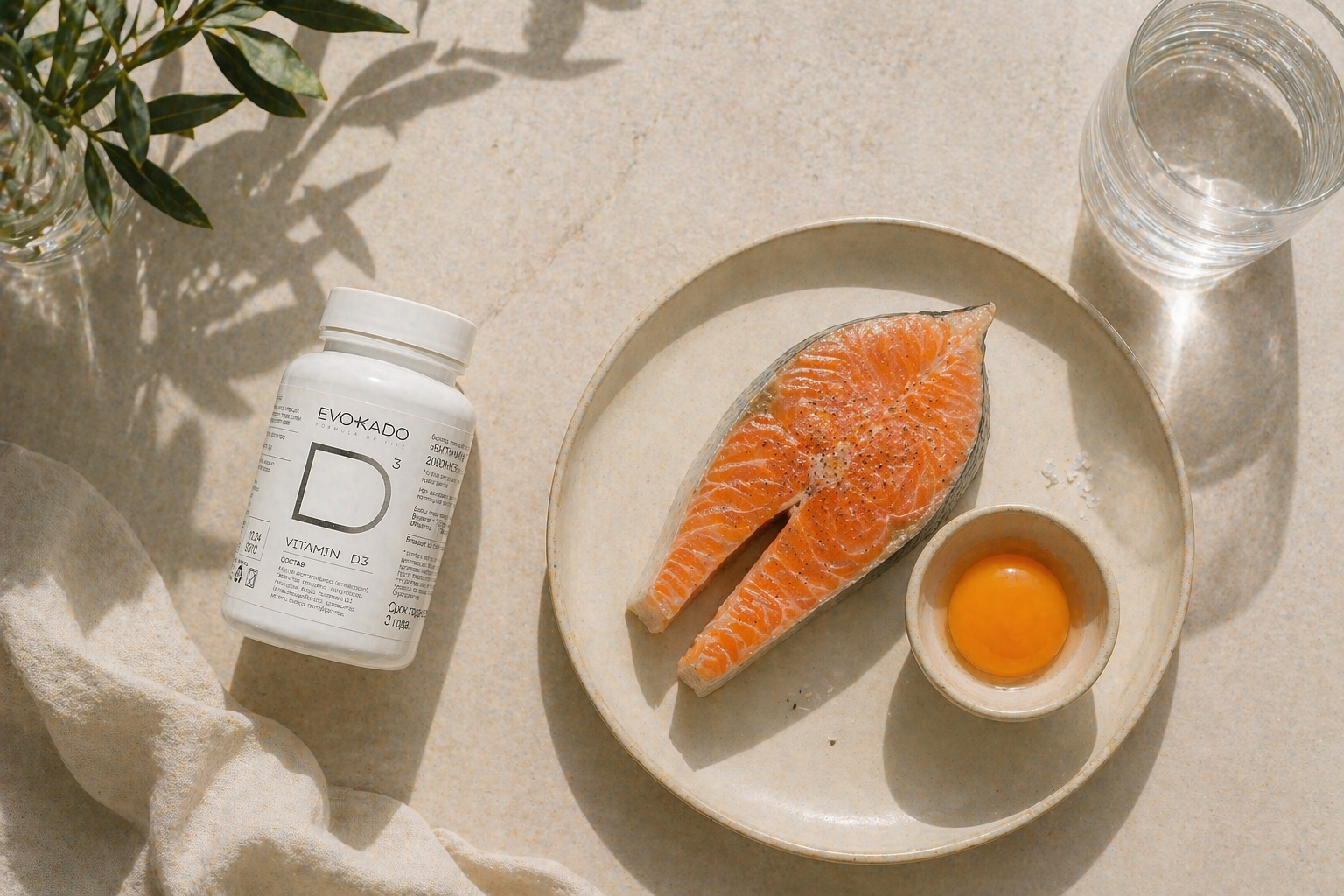 Это витамин, который тело само умеет делать под солнцем, но в нашей полосе солнца почти не бывает. D3 помогает костям быть крепкими, иммунитету не сдаваться, мышцам работать, а настроению не падать ниже плинтуса.